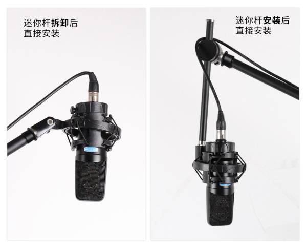 頂端的迷你橫桿可左右拉動(dòng)調(diào)節(jié),整個(gè)迷你橫桿可180°上下調(diào)節(jié),助力您找到更理想的擺放方式。迷你桿拆卸后,話筒夾可直接固定在橫桿上,滿足多種需求。